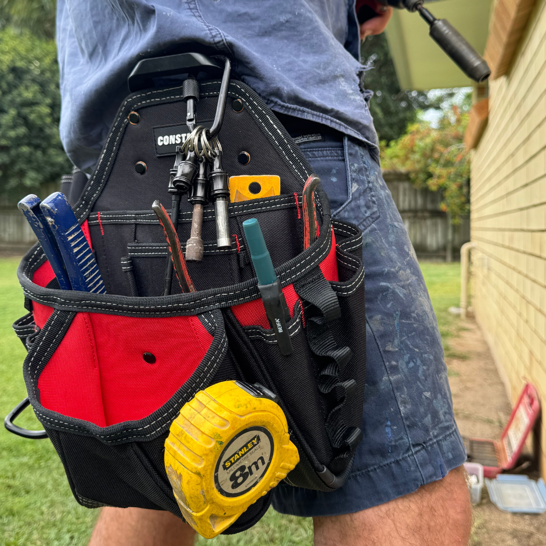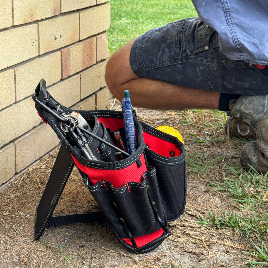 Simply unclip it from your belt and set it next to you while you’re crouched or kneeling for installs; the reinforced, self-standing base keeps it upright and stable, so your tools and fittings stay organised and within easy reach.